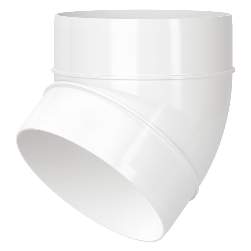 Fehér PVC-ből készült, befúváshoz és elszíváshoz használt légtechnikai elem. Műanyag könyök idom, 150 mm körcsatornához, 45 fok.