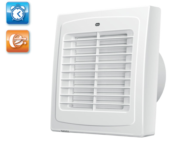 UV-álló ABS műanyagból készült, fürdőszoba, zuhanyzó, konyha és egyéb használati helyiség folyamatos vagy időszakos elszívására. Automata zsalus háztartási ventilátor, 125 mm légcsatornához, időrelével.