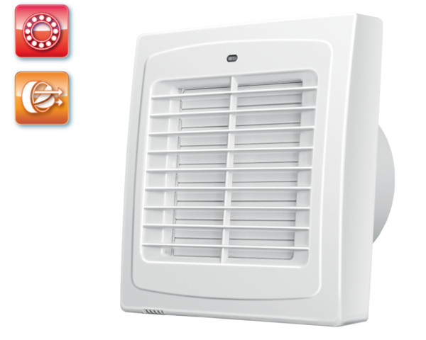 UV-álló ABS műanyagból készült, fürdőszoba, zuhanyzó, konyha és egyéb használati helyiség folyamatos vagy időszakos elszívására. Automata zsalus háztartási ventilátor, 150 mm légcsatornához. Golyóscsapágyas kivitel.