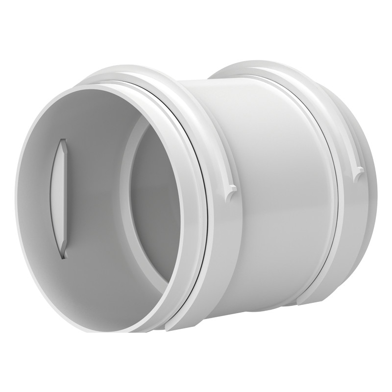 Csőtoldó idom, 75 mm-es rendszerhez, rögzítőgyűrűkkel. Blaufast légcsatorna rendszerrel kompatibilis.