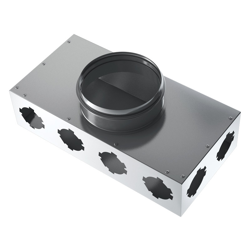 Fém légelosztó doboz felső csatlakozással. (160 mm/8x75 mm) Blaufast légcsatorna rendszerrel kompatibilis.