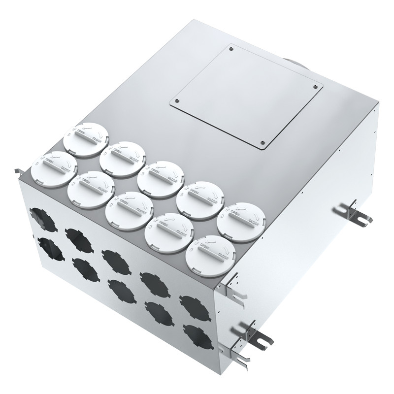 Fém légelosztó doboz hátsó csatlakozással. (200 mm/10x75 mm) Blaufast légcsatorna rendszerrel kompatibilis.