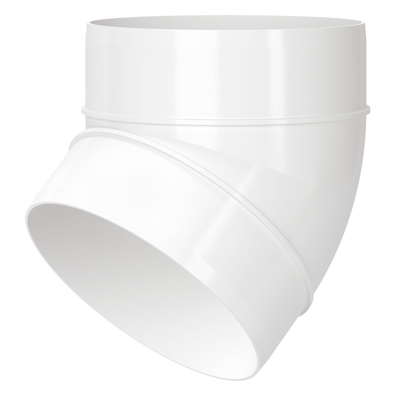 Fehér PVC-ből készült, befúváshoz és elszíváshoz használt légtechnikai elem. Műanyag könyök idom, 150 mm körcsatornához, 45 fok