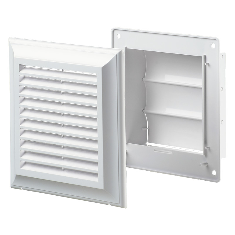 Műanyag rács befúváshoz és elszíváshoz. Hő és UV álló, antisztatikus anyagból készült. Fehér szín, négyszögletes kialakítás. Gravitációs zsaluval. Csőcsatlakozás nélkül. 140x140 mm.