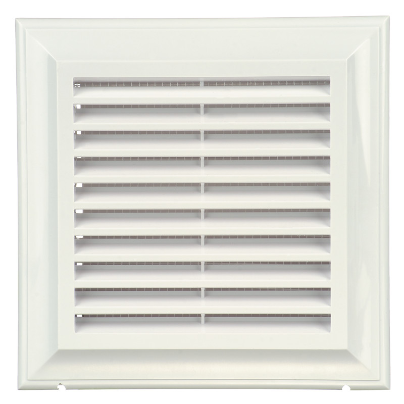 Műanyag rács befúváshoz és elszíváshoz. Hő és UV álló, antisztatikus anyagból készült. Fehér szín, négyszögletes kialakítás. Csőcsatlakozás nélkül. 180x180 mm.