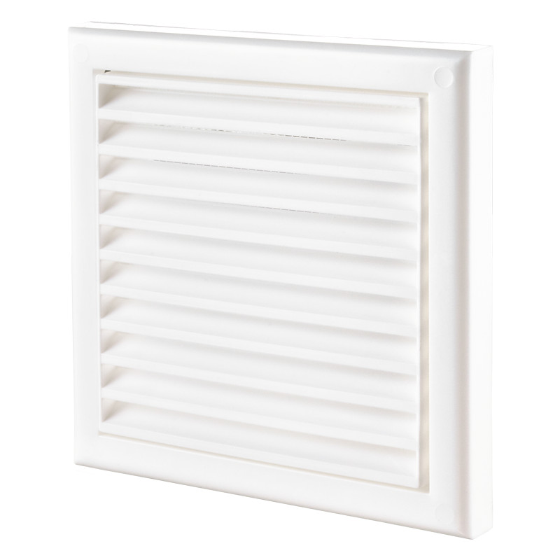 Műanyag rács befúváshoz és elszíváshoz. Hő és UV álló, antisztatikus anyagból készült. Fehér szín, négyszögletes kialakítás. Szúnyoghálóval. 150 mm átmérő csőcsatlakozás. 250x250 mm.