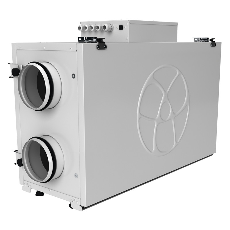 Hővisszanyerős légkezelő berendezés az energiahatékony szellőztetés kialakításához lakásokban, családi házakban, irodákban és egyéb helyiségekben. Hő és akár páravisszanyeréssel csökkenthetjük az energiafelhasználást és növelhetjük a komfortot a belső terekben. Vezérléssel testreszabható és igény szerint szabályozható a szellőzés az épületben. Légkezelő berendezés álló vagy oldalfali beépítés, EC motor, horizontális 125 mm-es csonkokkal, keresztáramú entalpia hővisszanyerővel, 250 m3/h 100 Pa teljesítménnyel, S14 vezérléssel.