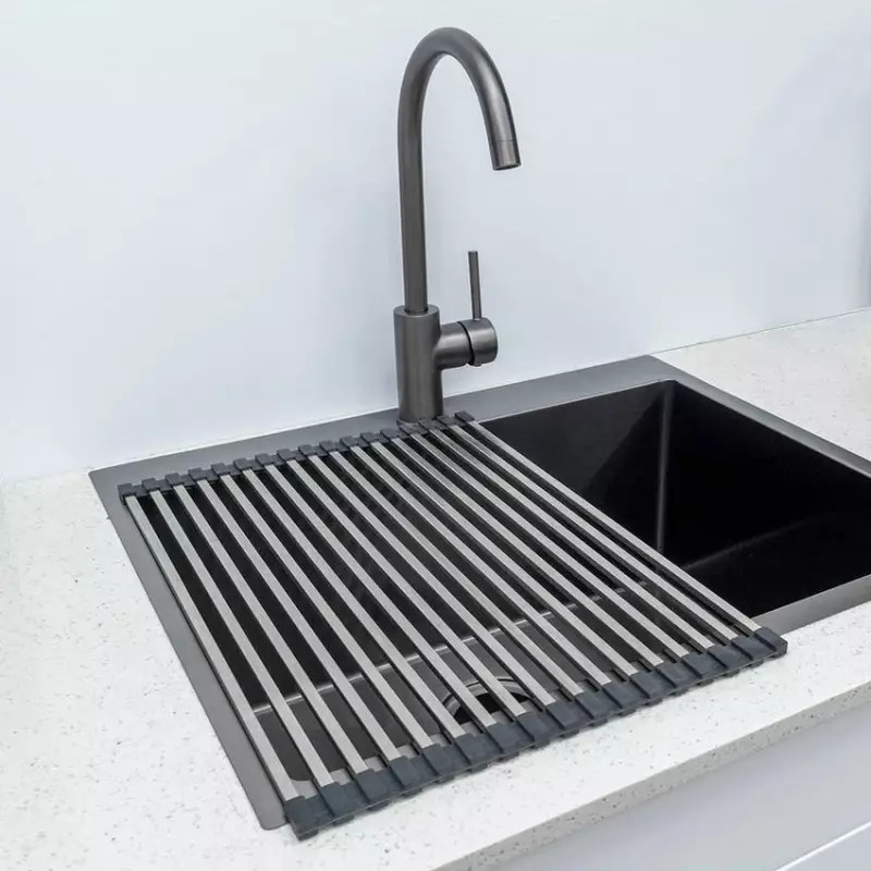 Megbízható társ a mindennapokbanAz Elleci Rollmat 500 szürke edényszárító egy elegáns, mégis rendkívül praktikus kiegészítője lehet bármely modern konyhának. Azok számára készült, akik értékelik a kifinomult megoldásokat, a megbízhatóságot, valamint a mindennapi kényelem növelését – mindezt hosszú távon. A szürke színű, visszafogott stílusú edényszárító tökéletesen illeszkedik bármilyen konyhai környezetbe, miközben letisztult megjelenésével az otthon rendezettségét is támogatja.Kiváló minőségű anyaghasználat a tartósság jegyébenA Rollmat 500 nem csupán esztétikai élményt nyújt, hanem anyaghasználatában is a minőség és a funkcionalitás harmóniáját képviseli. Az edényszárító szilikonnal bevont acélrudakból áll, amely kombináció biztosítja az erős tartást, a hosszú élettartamot, ugyanakkor kíméletes az edényekhez. A szilikon bevonat nem csupán stabilitást ad a szárítás során, de védelmet is nyújt az érzékeny felületek karcolódásával szemben. Ez a prémium anyagválasztás garancia arra, hogy az edényszárító hosszú éveken keresztül is megbízhatóan szolgálja tulajdonosát.Kényelmes és sokoldalú használat Elleci mosogatókhoz tervezveAz Elleci Rollmat 500 kifejezetten a 500 mm mélységű Elleci mosogatókhoz készült, és tökéletesen illeszkedik a munkalapra vagy a munkalap alá szerelt modellekhez. Ez a precíz illeszkedés nem csupán esztétikai, hanem funkcionális előnyt is jelent: biztonságos, stabil felületet biztosít az edények szárításához. Használata egyszerű és kényelmes, még azok számára is, akik előnyben részesítik az átlátható, praktikus megoldásokat a bonyolult kiegészítőkkel szemben.Összecsukható kialakításAz egyik legnagyobb előnye, hogy a Rollmat 500 edényszárító teljes mértékben összecsukható. Használaton kívül egyszerűen összetekerhető, így kis helyen is elfér a fiókban vagy a szekrényben. Ez különösen értékes tulajdonság azok számára, akik nem szeretnék, hogy a konyhai eszközök állandóan szem előtt legyenek. A rugalmas kialakítás révén a konyha rendezett marad, miközben a szárítási felület bármikor könnyen rendelkezésre áll.Könnyű tisztítás és magas hőállóságA Rollmat 500 karbantartása nem igényel különösebb odafigyelést – egyszerűen tisztán tartható, akár mosogatógépben is elmosható. Ez különösen előnyös azoknak, akik értékelik a higiénikus konyhai környezetet, de nem szeretnének sok időt tölteni a tisztítással. Emellett a termék 230 °C-ig hőálló, így meleg edények vagy edényaljak lehelyezésére is bátran használható, anélkül hogy az anyag károsodna. Ez a tulajdonság tovább növeli a termék biztonságos és sokoldalú felhasználhatóságát.Tartós befektetés az otthoni komfort érdekébenAz Elleci Rollmat 500 edényszárító nem csupán egy egyszerű kiegészítő, hanem egy hosszú távú, praktikus és megbízható megoldás a mindennapi konyhai feladatokhoz. Olyan vásárlók számára készült, akik nem kívánnak kompromisszumot kötni a minőség és a funkcionalitás terén. A gondosan tervezett részletek és az időtálló kialakítás hozzájárulnak ahhoz, hogy a konyhában töltött idő még kellemesebb és hatékonyabb legyen.Engedje, hogy az Elleci Rollmat évekig szolgálja otthona kényelmétHa olyan megoldást keres, amely egyszerre stílusos, tartós és praktikus, akkor az Elleci Rollmat 500 kiváló választás lehet. Fedezze fel a kényelmet, amit ez a minőségi edényszárító nyújt – és élvezze a gondosan kialakított részleteket, amelyek megkönnyítik a mindennapokat. Vásároljon bizalommal, és tapasztalja meg a valóban hasznos konyhai kiegészítő előnyeit, mely hosszú éveken át az Ön kényelmét szolgálja.