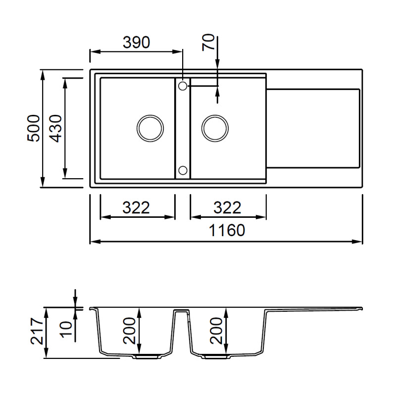 A 1160x500 mm-es teljes méret és a 200 mm-es medencemélység ideális a nagyobb konyhai feladatokhoz, legyen szó nagyméretű edények elmosásáról vagy bőséges zöldségmennyiség előkészítéséről. A 1140x480 mm-es kivágási méret és a 800 mm-es szekrényméret biztosítja, hogy a mosogató harmonikusan illeszkedjen a konyhabútorba, a gyárilag elhelyezett rögzítőfülek pedig megkönnyítik a stabil, pontos beépítést.