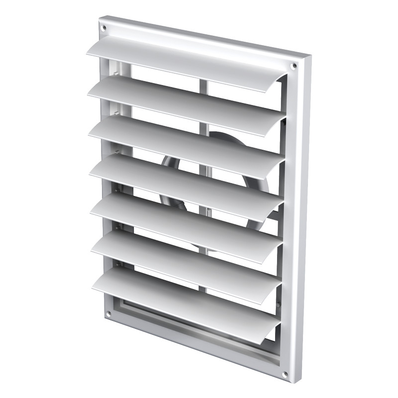 Műanyag takaróelem lakossági, közületi vagy ipari szellőzőrendszerek be- és elszívónyílásainak lezárására. Fehér szín, négyszögletes kialakítás. Szúnyoghálóval. 100-150 mm átmérő állítható csőcsatlakozás. 221x299 mm.
