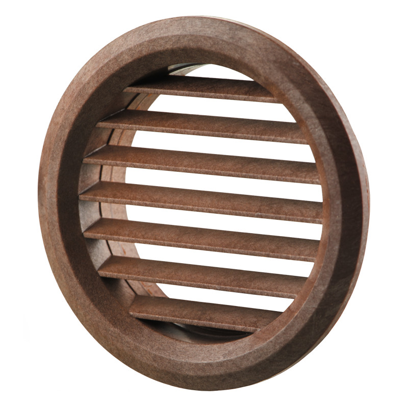 Műanyag takaróelem lakossági, közületi vagy ipari szellőzőrendszerek be- és elszívónyílásainak lezárására. Sötét faerezet minta, kerek kialakítás. Szúnyoghálóval. 80 mm átmérő csőcsatlakozás.