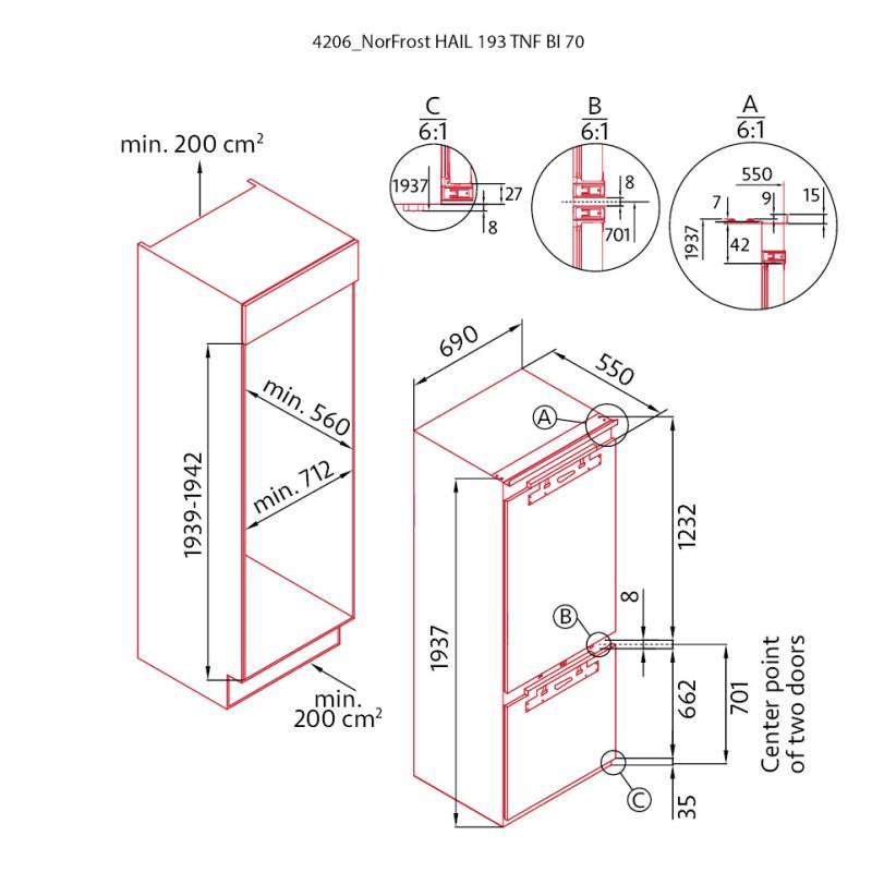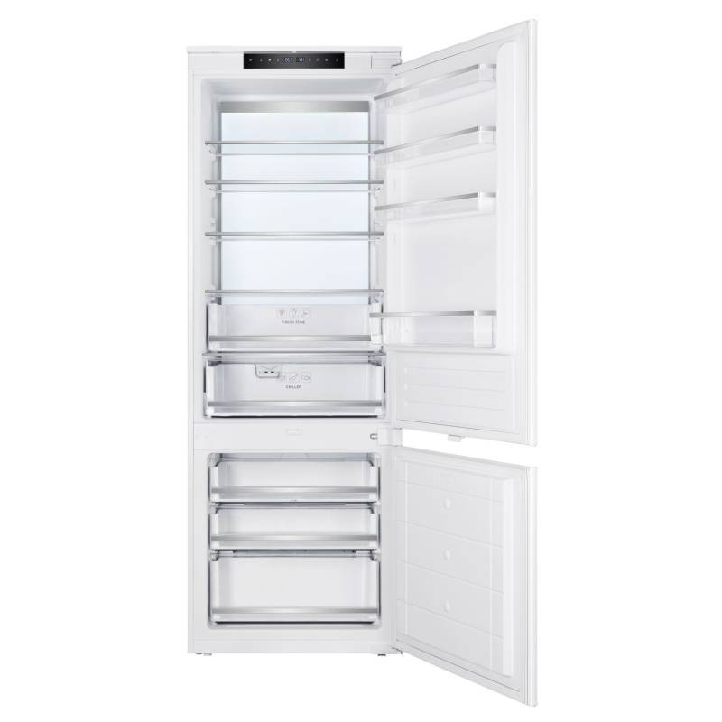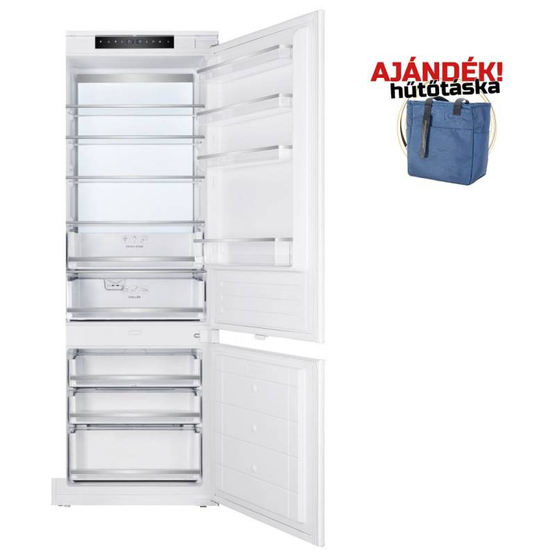 Nodor Norfrost HAIL-193 TNF BI 70 kombinált hűtőszekrény egyedi tulajdonságai:kombinált, alulfagyasztós beépíthető hűtőszekrény NO-FROST technológiával, LED világítás, 194 cm magas, 341 literes, 257 literes normál hűtőrész, 84 literes fagyasztó, elektronikus hőmérséklet szabályozás kijelzéssel, 5 db biztonsági üvegpolc, 4 db polc az ajtón, 1 db zöldségtartó fiók páratartalom szabályzással, 1 db 0 °C-os fiók, 3 db fagyasztó fiók, fogyasztás: 250 kWh/év, fagyasztó kapacitás: 3,8 Kg/24 óra, zajszint: 41 dB(A), megfordítható ajtónyitás, 69 cm széles