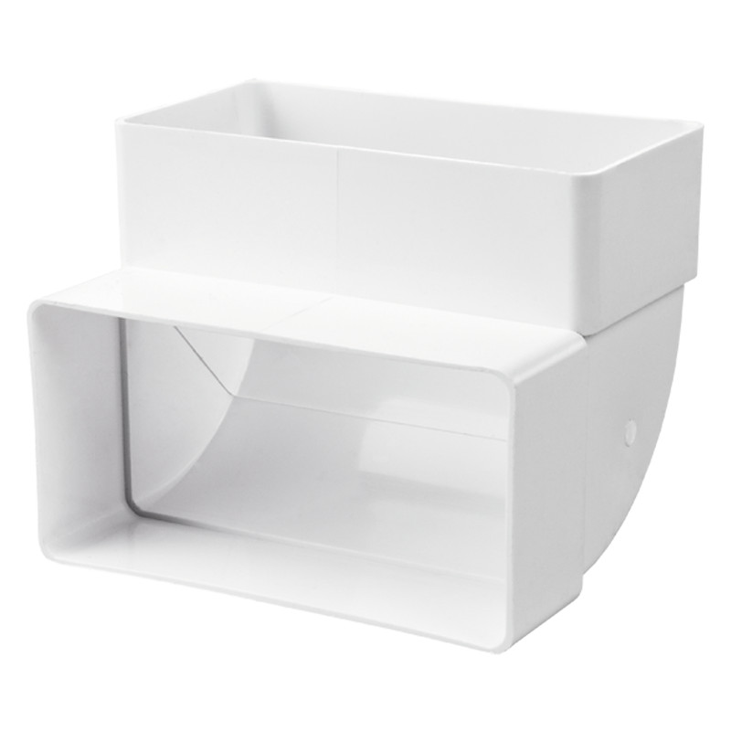 Fehér PVC-ből készült, befúváshoz és elszíváshoz használt légtechnikai elem. Műanyag négyszög könyökidom, vertikális, 55*110 mm keresztmetszethez, 90 fok.