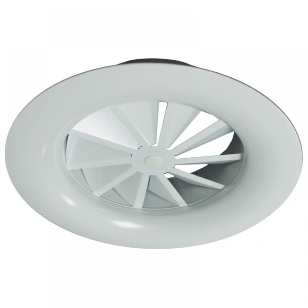 RWR-2 100 perdületes mennyezeti acél anemosztát fix lamellákkal; Maximális légszállítás 50 m³/h; Kör alakú örvényes mennyezeti anemosztát, sík felülettel; Levegő befúvásra és elszívásra alkalmas, szellőző és légkondicionáló rendszerekben; Anyaga acél, fehér (RAL 9016) színben;