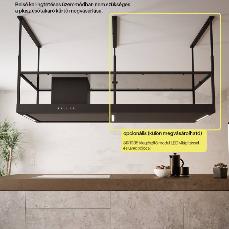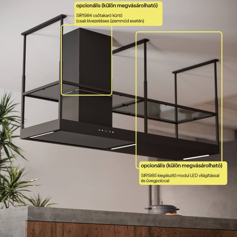 A Melody egy új, matt fekete színű, füstszínű üveg elemekkel díszített sziget elszívó. Az elszívó szélessége 90 cm, de külön rendelhet egy 90 cm széles polcos elemet, ami tökéletesen illeszkedik az elszívóhoz. A két elem együttes szélessége így eléri a 180 cm. Továbbá az ANTI-DROP rendszerrel felszerelt Symphony nem engedi a páralecsapódást és megakadályozza a kondenzvíz lecsapódását és a nagy hatékonyságú szénszűrőnek köszönhetően garantálja a főzési szagok tökéletes elszívását is.