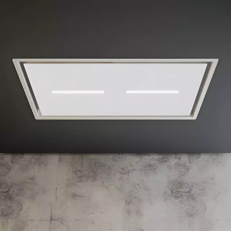A SIRIUS SLT-971 EM páraelszívó mennyezetbe építhető kivitele tökéletes választás azokba a modern konyhákba, ahol a tágas tér, a funkcionalitás és a letisztult forma harmóniája elsődleges szempont. A 120 cm széles készülékház elegánsan simul bele a mennyezeti síkba, miközben látványosan kiemeli a konyha magas színvonalú belsőépítészeti megoldásait. A fehérre festett rozsdamentes acél testet prémium fehér üveg panel koronázza meg, amely nemcsak látványos, hanem könnyen tisztán tartható is.