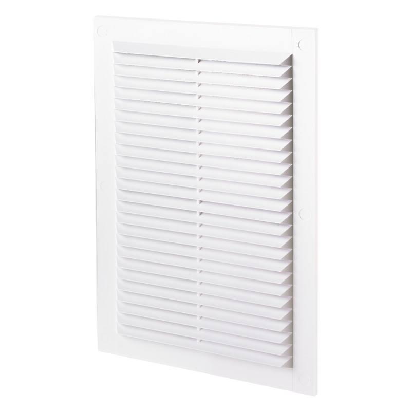 Műanyag takaróelem lakossági, közületi vagy ipari szellőzőrendszerek be- és elszívónyílásainak lezárására. Fehér szín, négyszögletes kialakítás. Szúnyoghálóval. Csőcsatlakozás nélkül. 182x251 mm.